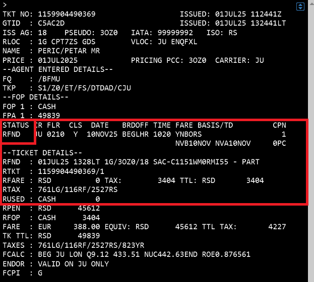 Primer 2: Prikaz istorije refundirane karte